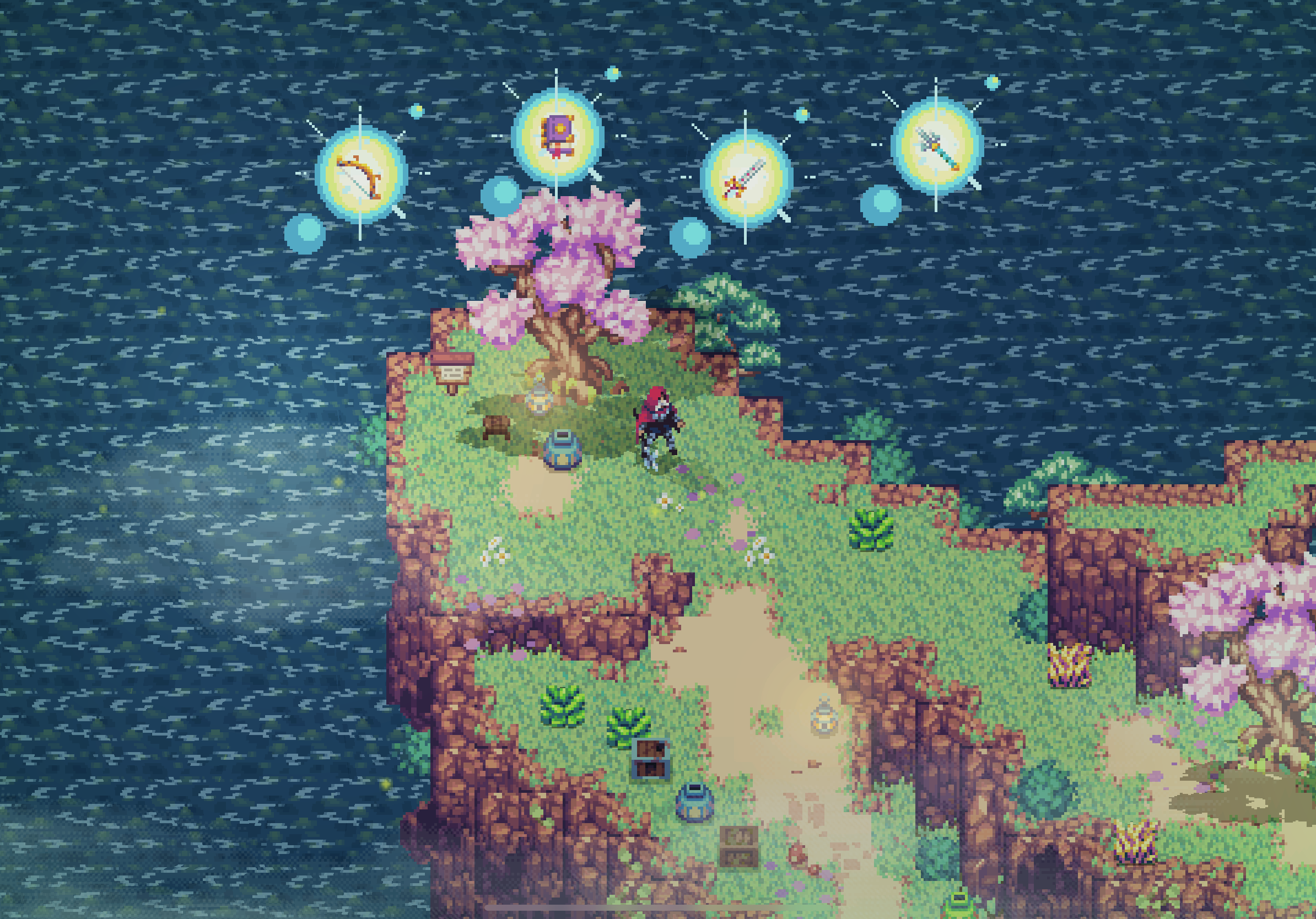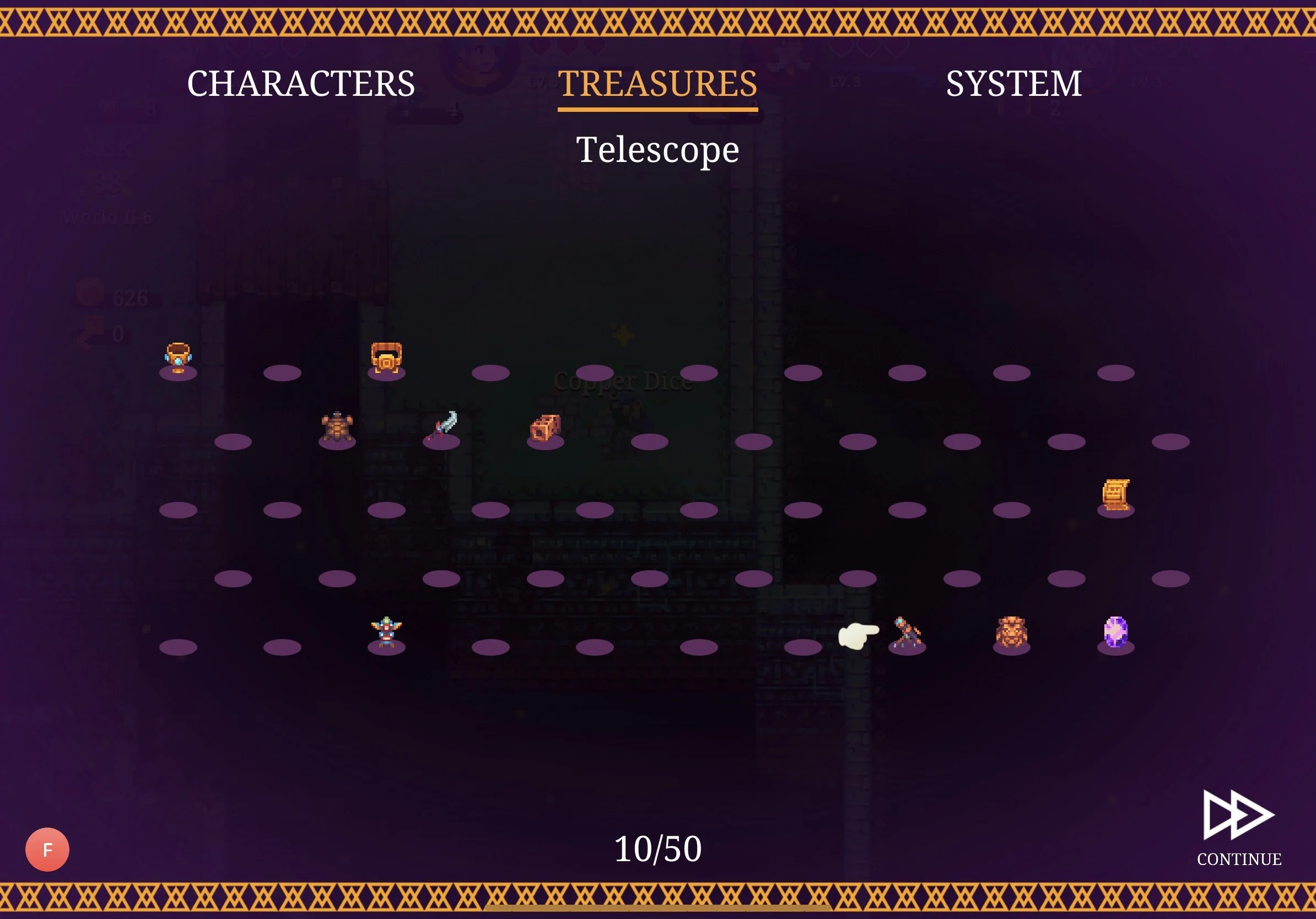 Last but not least, you need to know about hidden treasures. Now, when you enter a level where a special trinket is hidden, you'll see a purple chest fly around and disappear in a particular direction. If you explore the dungeon with that in mind, you'll eventually reach a place where one of these treasures is hidden. Once recovered, your menu will open on the new tab Treasures, displaying your current collection. Be it a Goblet of Sol, a Red Pendant, or a Blood Arrow, we've heard no one managed to collect all 50 of them – or at least, no one came back to tell the tale!
